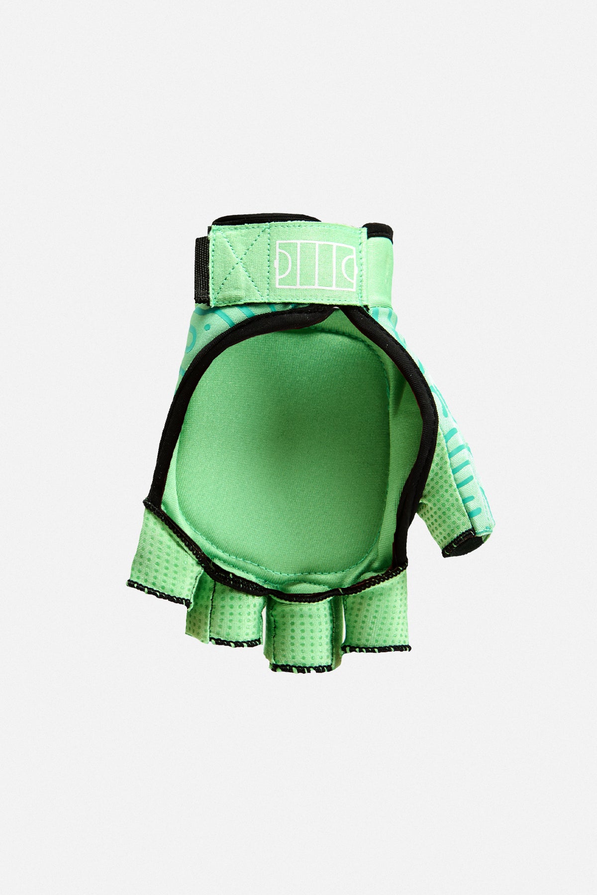 Knuckle protection with open fingers. Anatomical fit. Open palm for stick feel. Rubberized grip zones. Adjustable Velcro strap. Reinforced stitching.